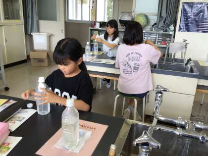 話を聞いた後は、水の入ったペットボトルの中に、ティッシュやトイレットペーパーを入れて振るとどうなるか、実験しました。あっという間に粉々になるトイレットペーパーを見て、子どもたちは、驚きの声をあげていました。