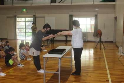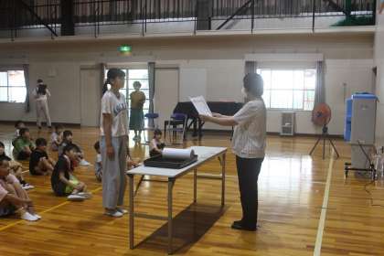 また、金魚花火のポスター募集で表彰された児童へ、校長先生からあらためて賞状が渡されました。おめでとうございます。