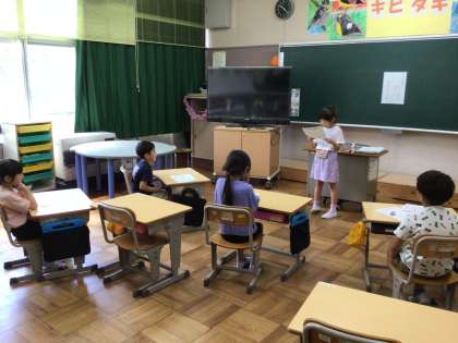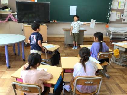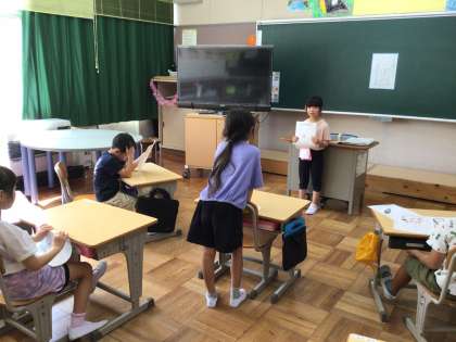 1年生は全員揃って、夏休み明け初日を迎えることができました。最初の授業は、夏休みの思い出を話しました。みんないい表情で思い出を振り返っていました。また、友達の発表を聞いて、ハンドサインを使って質問をしました。