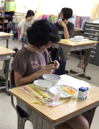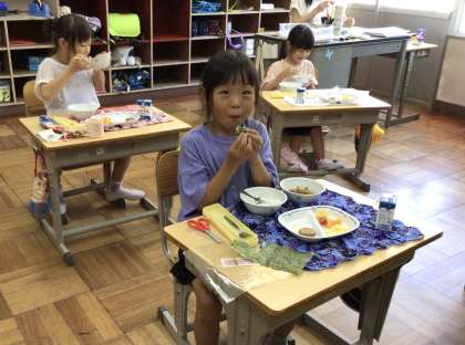 大きな海苔の上にご飯をのせ、梅びしおをのせ、袋ごと海苔で包み、おにぎりを作ります。でも、子どもたちは食べやすさを考え、海苔を小さく切ってご飯をのせ、海苔巻きのようにして食べている子が多かったです。