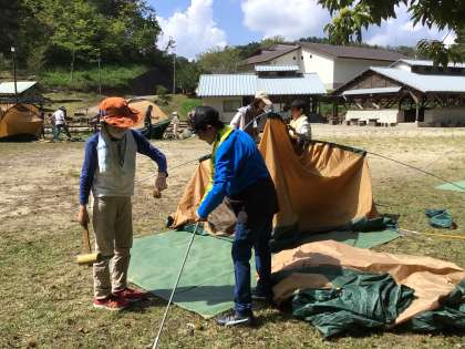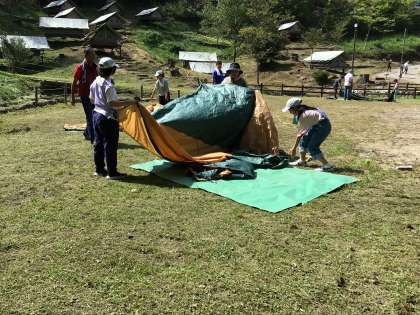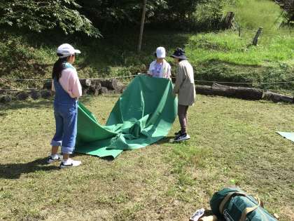男子3人に一つ、女子は2人に一つテントをたてました。袋から出したテント、何をどうしたらいいのか戸惑いながらも、たて方を教えてもらいながら、友達と一緒に頑張りました。