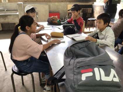幸海小と豊松小の子と合同の班で活動開始。自己紹介をしたあと、班のめあてを決めて、係分担をしました。
