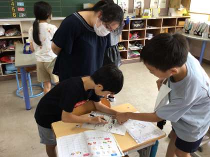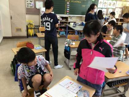 外国語の授業では、ALTの先生と一緒に英語を学んでいます。友達の好きなスポーツとフルーツを尋ね合う活動では、予想しながら楽しんで活動することができました。