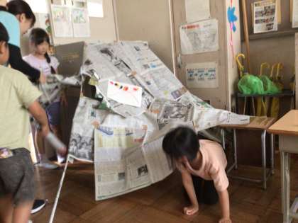 1年生教室をのぞくと、教室は薄暗く、モニターには焚き火。教室の隅っこには図工で学習した新聞紙を使った構造物「テント」がありました。まさにキャンプ場です。子どもたちは、たった一つのカップヌードルをめぐって、ゲームをして盛り上がっていました。