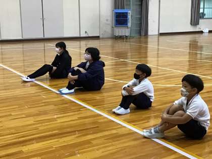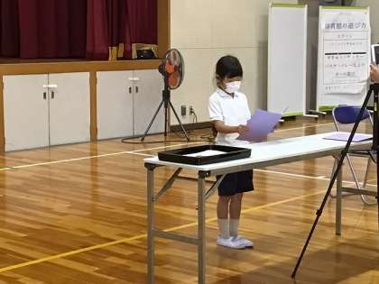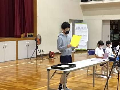 4人の児童代表の子たちが、それぞれ前期に頑張ったことと後期に頑張りたいことを発表しました。キャンプでがんばったことや愛鳥活動でがんばったことなど、たくさんの頑張りを聞くことができました。また、後期は行事が多いので、運動会や学芸会で頑張りたいことなどを話していました。目標に向かっての頑張る子どもたちを応援していきたいと思います。