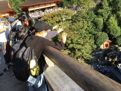 いよいよ清水寺の見学です。清水寺もたくさんの観光客でいっぱいでした。清水の舞台から下にいる人たちと手をふり合い、ちょっと嬉しい気持ちになりました。修学旅行ならではの光景でした。