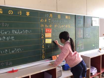 朝、1年教室に行くと、1年生の子が、イスにのぼったり降りたりしながら、予定黒板に今日の予定を書いていました。