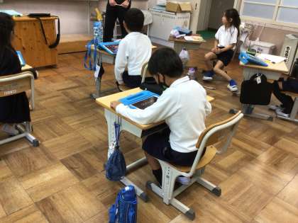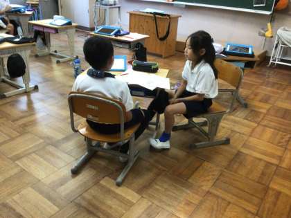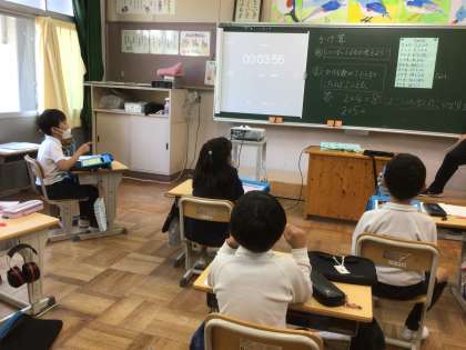 2年生が九九の学習をしています。今日は、2の段を何回も繰り返し言っていました。ペアになって友達に聞いてもらったり、自分のタブレットでタイムを計ったり、みんなでリレーしてタイムを計ったりして、頑張っていました。