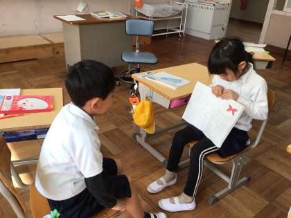 国語の学習で、友達と楽しく話をする方法を学んでいます。教科書の挿絵が何に見えるか、友達と話をしました。「かわいいね!」「そうなんだね」「どこが○○ですか?」など、話を繋げる言葉をたくさん使うことができました。