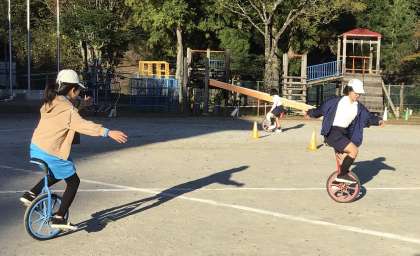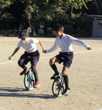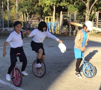 運動会の練習、頑張っています。5年生の一輪車特訓の様子です。