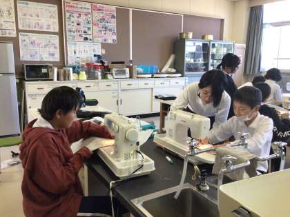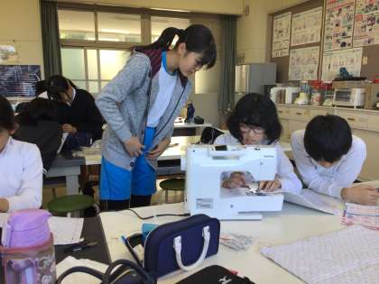 家庭科の授業で、ナップザック作りをしています。4人チームで作り方を確認したり、分からないところを伝え合ったりして協力することができています。難しい作業は、タブレットで動画を繰り返し見ながら丁寧に確認していました。完成するのが楽しみです。
