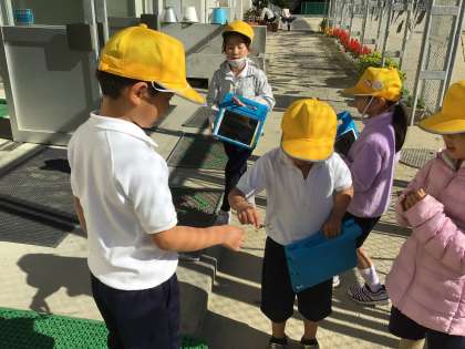 国語科の学習で、観察カードを書く学習を始めました。今日は校庭に出て校庭を探検し、見たり、聞いたり、触ったり、においを嗅いだりして、観察カードに書くものを探しました。銀杏を見つけて「くさい!」と笑ったり、カマキリを見つけて「触るとふわふわだね」「噛まれて痛かったなあ」と言っていました。