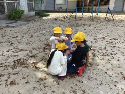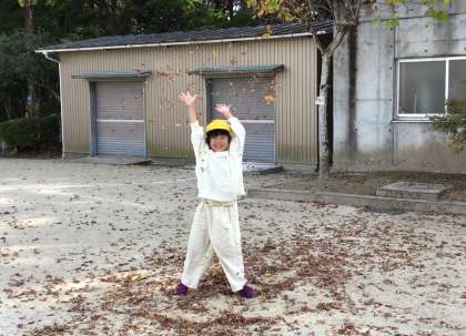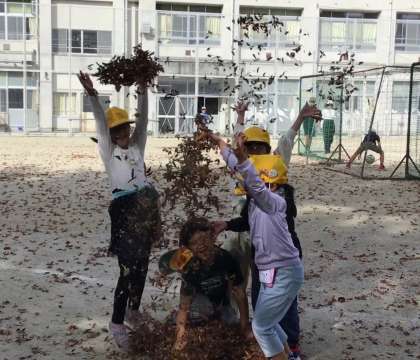 運動場や学校周辺は、校長先生や公務手さんが落ち葉を綺麗にはいてくださっていますが、今朝の運動場にはこの三連休で溜まった落ち葉がたくさんありました。2時間目の学習が早く終わったので、放課より早めに運動場へ出て、落ち葉を集めて遊びました。「落ち葉の雨だ!」「シャクシャク音がして面白いね」と言いながら楽しみました。また、落ち葉を集めた上に座り、「鳥の巣だよ、卵を温めているよ」と、ここでも鳥ごっこをしていました。