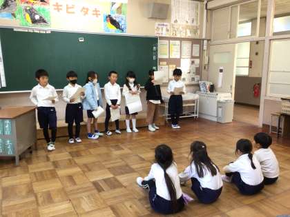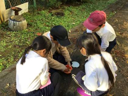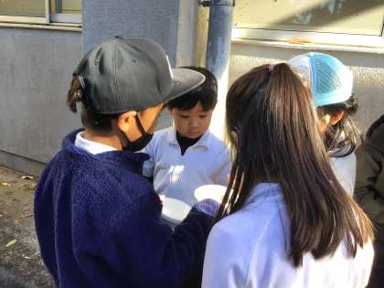 11/13 給餌活動スタート!(低学年) 公開日 2023/11/13 更新日 2023/11/13 各学年から 滝脇小低学年、毎年恒例の給餌活動がスタートしました。給餌とは、寒さで餌が少ない中でも鳥たちが冬を越せるように、餌をあげる活動です。滝脇の鳥が元気に暮らせるように、低学年が餌やりを頑張ります。初めて給餌を行う1年生のため、2年生が説明をしてくれました。これからどんな鳥が給餌台に来てくれるか楽しみですね。