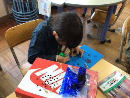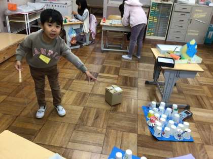 生活科で2年生と合同で、おもちゃを作る活動を行なっています。魚釣りゲームを作り、「これを釣ったらもう一回できるよ」「これを釣ると、前釣った魚を食べられちゃうよ」と、楽しそうにルールを説明してくれました。お客さんを呼ぶのが楽しみですね。
