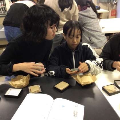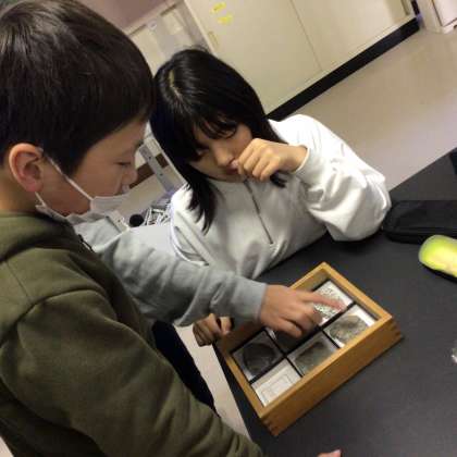 この日は3種類の堆積岩を手にとり、触った感触や粒の大きさなどをじっくりと観察し、特徴を見つけていました。