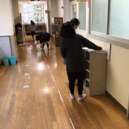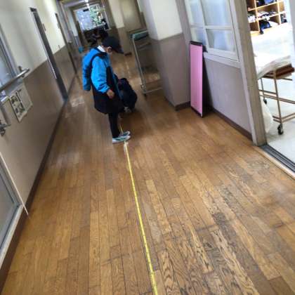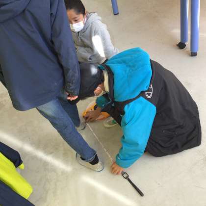 5年生は廊下の長さを測る方法について考え、実験と言いながら自分の歩幅を調べていました。