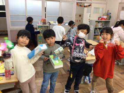図工で、身近な道具を使って楽器を作る学習を行いました。空き缶にビーズを入れてマラカスにしたり、割り箸をバチにして太鼓を作ったり、さまざまな工夫が見られました。みんなに自分の楽器の音を聴いてもらえた子はとても嬉しそうでした。