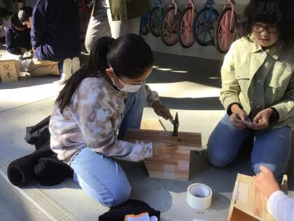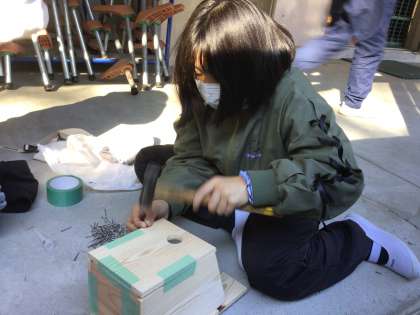 段々と巣箱のくぎ打ちに慣れてきたようです。