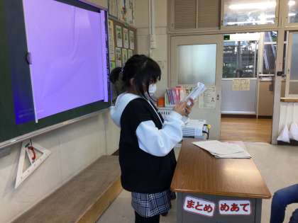 国語の授業では、「大造じいさんとがん」を勉強しました。最後に、自分のお気に入りの場面を決め、その理由とどのように表現するかを考えて、発表会をしました。