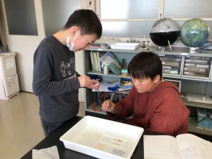 実験では、水溶液の性質を調べました。リトマス紙を使って、酸性かアルカリ性かを調べます。「これ、アルカリ性なの?!」「もっと調べてみたい!」という声が聞こえてきました。