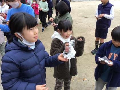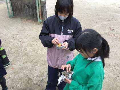 19日(火)に、ヤマガラ、カワセミ学級が育てた、さつまいもを食べる会がありました。寒い中でしたが、温かい焼き芋を食べて、みんなで温まりました。
