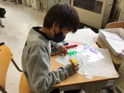 図工の「光と場所のハーモニー」の授業では、ステンドグラス風飾りを作りました。クリスマスが近いので、クリスマスの飾りを作る子もいました。