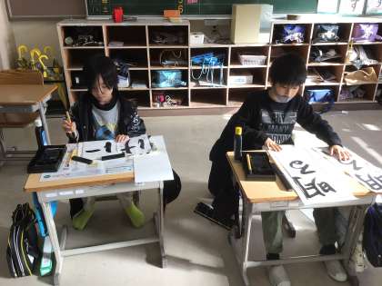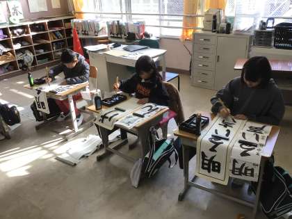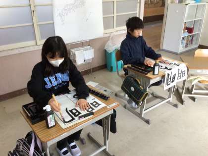 1月9日に、書き初め大会を行いました。久しぶりの学校ですが、みんな集中してきれいな字が書けましたね。
