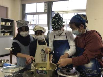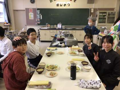 家庭科の授業で、調理実習をしました。栄養素や献立の決め方について学び、栄養バランスを考えながら1日分の献立を考えました。必要な材料を考えたり、調理の分担をしたり、計画も頑張ることができました。2班は、中華の献立です。