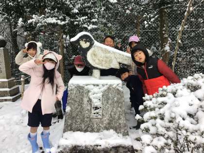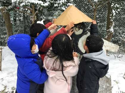 そこで、みんなでかさこを作り、校庭のシジュウカラ像にかぶせてあげました。