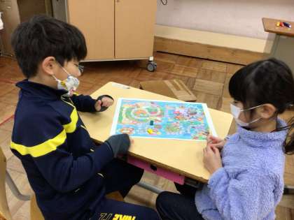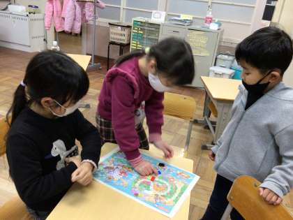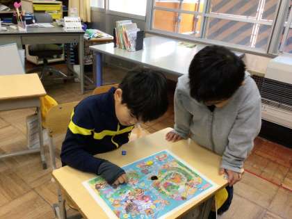 算数科の「大きい数」の学習で、100がゴールのすごろくを行いました。子どもたちは「いま63!」と数字を声に出しながら、駒が少しずつ進んでいくのを楽しんでいました。