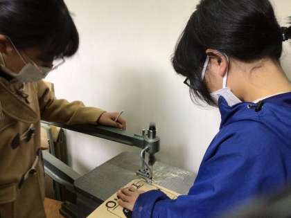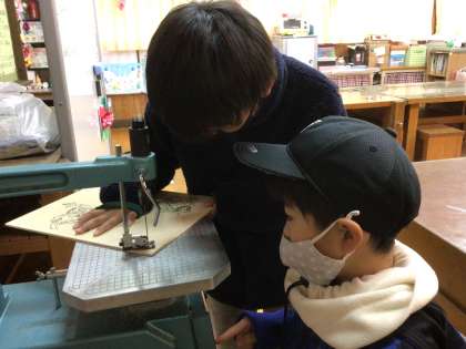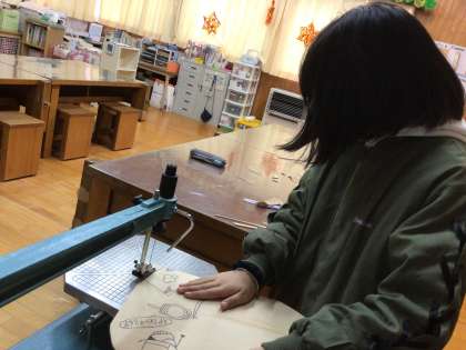 図工の授業で、糸のこぎりに挑戦しました。最初は、ゆっくり慎重に切っていきます。