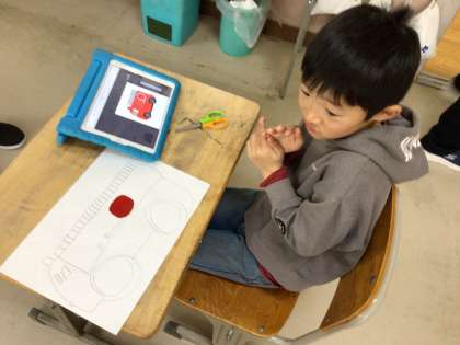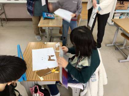 図工の時間で、紙版画を作っています。左右の向きが逆にならないようにみんな気をつけて作っています。もう少しで完成しそうですね。