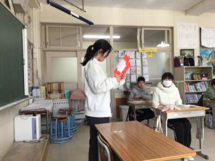 卒業まであと15日です。今日は、国語の授業で「プロフェッショナルたち」の発表会をしました。教科書に載っている3人のプロフェッショナルたちの話を読み、自分が思う「プロフェッショナル」とはどんな人なのかを発表しました。自分の周りにいる人を例にしたり、経験をもとに話したり、工夫がたくさん見られました。