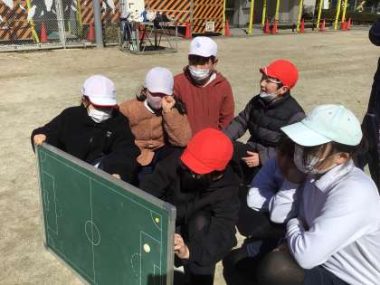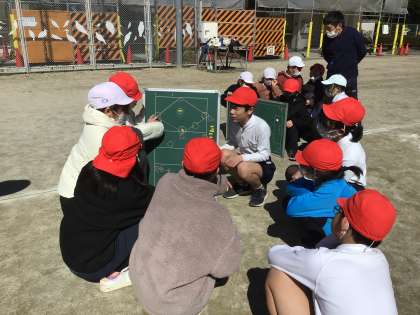 体育の授業で、キックベースに挑戦しています。グループで打順を決めたり、ルールを学んだり、楽しく活動することができました。