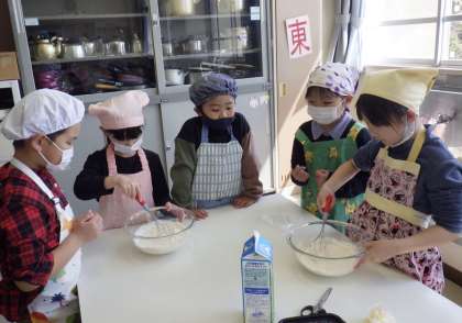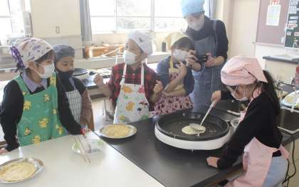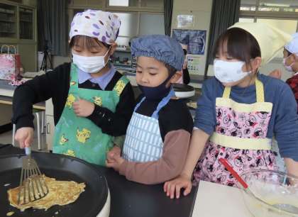 一年生最後の思い出作りとして、みんなでクレープを作って食べる、調理実習を行いました。みんな楽しく真剣に作っていました。ひっくり返すのがみんな上手で、破れず綺麗なクレープ生地ができました。