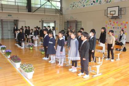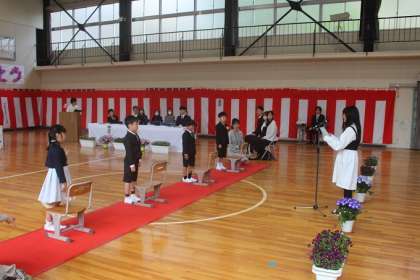 入学式の中で代表児童が、滝脇小学校のおすすめを3つ、1年生に伝えました。それは「鳥の学校」「運動会」「学芸会」です。楽しみですね。