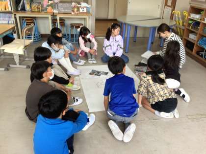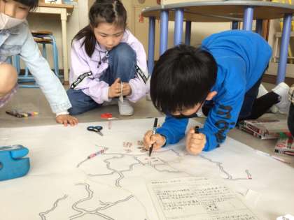 昨日知ったことや学んだことをもとに、シロハラ学級みんなで大きい地図作りを始めました。一人では書ききれなかったことも、みんなで協力するとすごく詳しい地図ができそうです。みんなで分担しながら、どんどん進めていきます。完成が楽しみです。