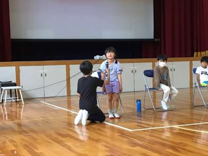 インタビューに、しっかり答えることができました。全校でクイズやゲームをして、楽しい時間を過ごしました。