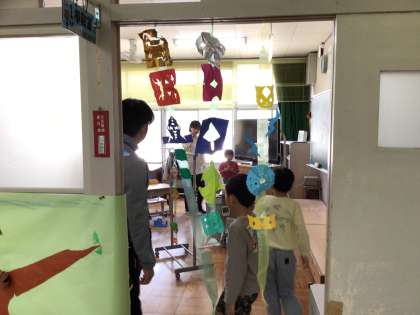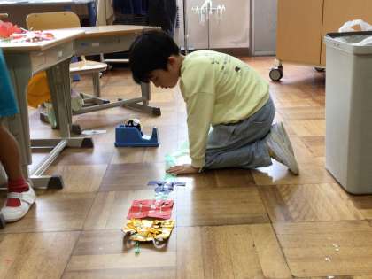 はさみで折り紙をチョキチョキ切って、いろいろな飾りを作りました。