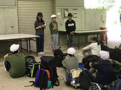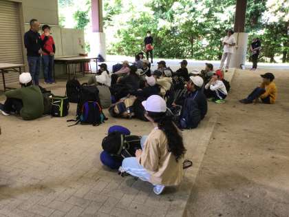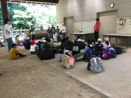 日差しが強く、気温が高いため、雨天ファイヤー場で、入所式を行いました。3校の学校紹介もしました。楽しみにしていたキャンプのスタートです。