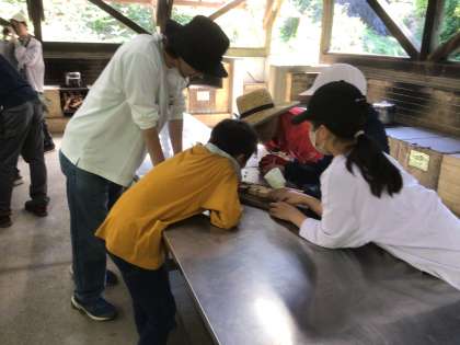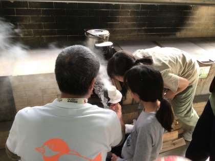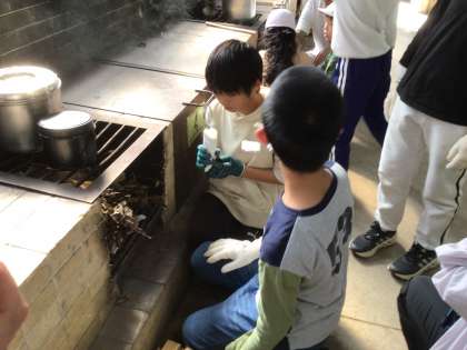 6/5 キャンプ(火起こし2) 公開日 2024/06/06 更新日 2024/06/06 各学年から みんなで頑張って作った火種だねを、トイレットペーパーで包み、火をつけます。火種の火を消してしまわないように、やさしく火を吹きかけます。