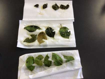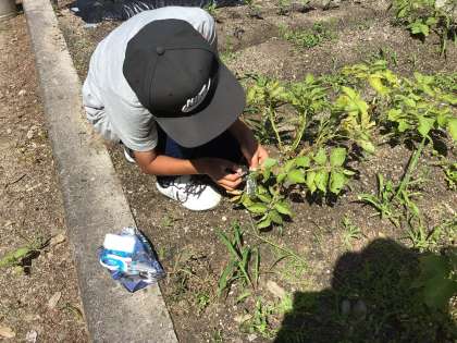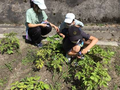 理科「植物の体のつくりとはたらき」の授業では、畑に植えたじゃがいもの葉を使って日光が当たると葉にデンプンができるかどうか実験しました。その結果、日光に当てた葉はヨウ素液につけると青むらさき色に変化しました。