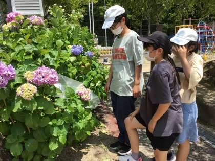 理科の授業では、「水は葉までいきわたった後、どうなるか」実験をしました。結果は、水蒸気となって葉から出ていました。紫陽花の葉も桜の葉でも分かりましたね。