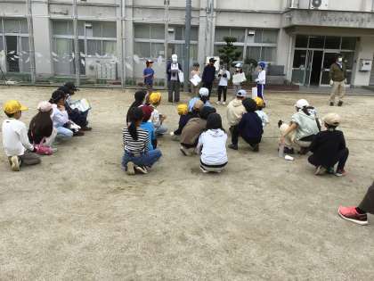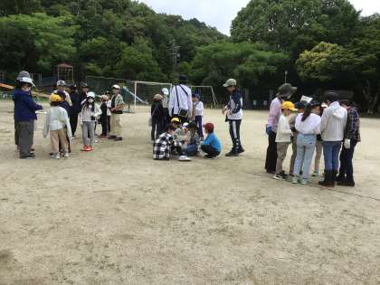 愛鳥委員会の企画で、野鳥の森探検ビンゴを行いました。全校の子どもたちが5つのグループに分かれて、ビンゴカードに書いてあるお題をクリアするために、野鳥の森を探検します。お題は、大きな葉っぱを持ってくる、キノコを見つける、10cmの枝を持ってくるなど、全部で9つです。各グループ、しっかり作戦を立てて、野鳥の森に入って行きました。