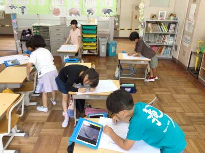今日の図工では、愛鳥ポスターの下書きをしました。滝っ子らしく、みんな一生懸命に鳥の絵を描いています。