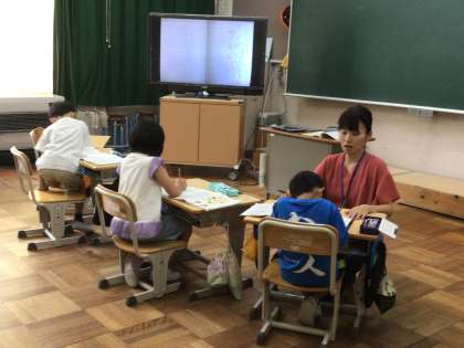 1年生が、カタカナの「ケ」の勉強をしていました。とめ、はらいに気をつけて、丁寧に書いていました。
