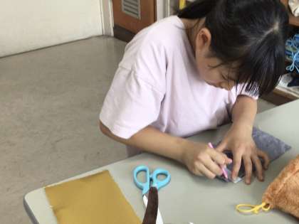 裁縫クラブでは、一人一人が作成するものを決めて作成計画を立てて活動しています。ファスナー付き筆箱、キーホルダー、ぬいぐるみ、カバンなどを作っています。今回のクラブでは、布の裁断をしたりフェルトを手縫いしたりミシンで縫ったりしました。作品の完成が楽しみです。