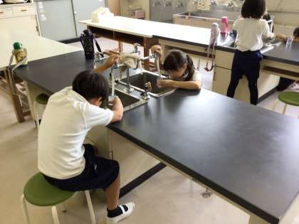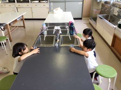 算数の「かさ」について、リットルますに水を入れながら、学びました。目盛りを見て、正しくかさを量って、水を入れることができました。
