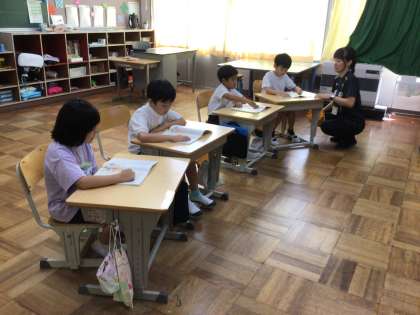 1年生が、「かいがら」という物語の学習をしていました。物語を聴きながら、指で教科書の文字をおっていました。どんなお話だったかな。